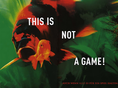 Here we see pictures from the catalog of Dumont, one of my German publishers. This Is Not a Game got a four-page spread in the middle of the catalog! (Michelle Houellebecq, John Cheever, and Haruki Murakami only got two pages each!) For a minute there, I thought they were going to keep the US title, but on further inspection I see the book has been retitled Off. I’m not sure what this has to do with anything, nor do I remember any carp in the book.